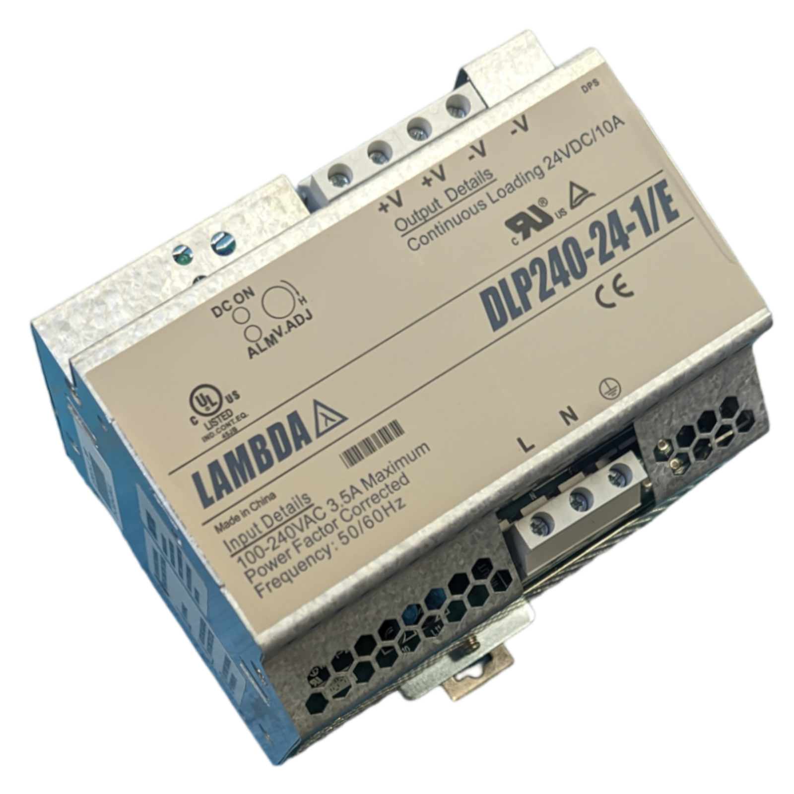 240W 24V DIN rail-mounted LED power supply from Lambda. 10A constant voltage output, ideal for panel board installations in commercial LED lighting control systems.