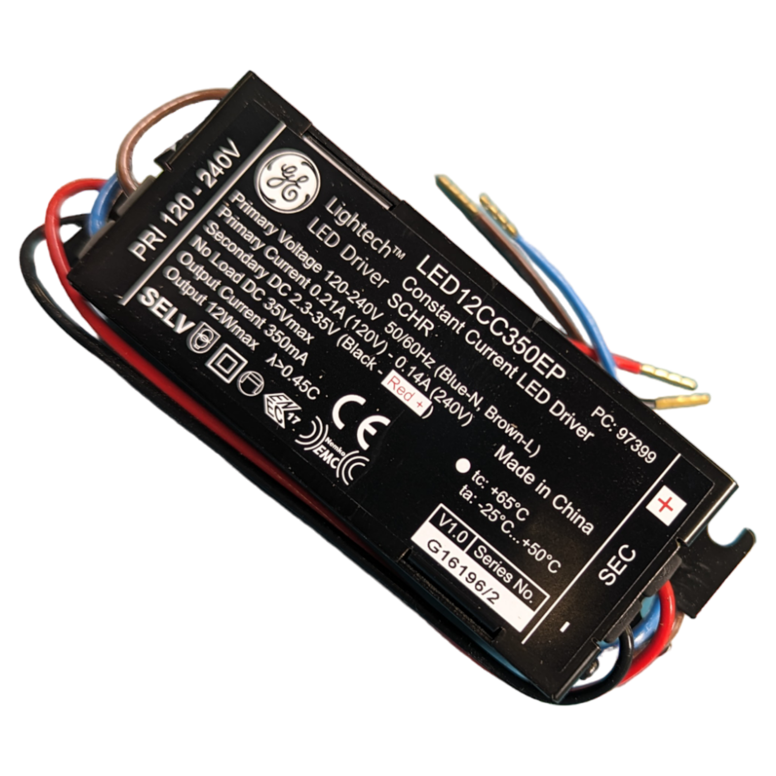 12W constant current LED driver from GE Lightech delivering 350mA output. Compact design with Class II and ENEC certification for small indoor LED lamp applications.