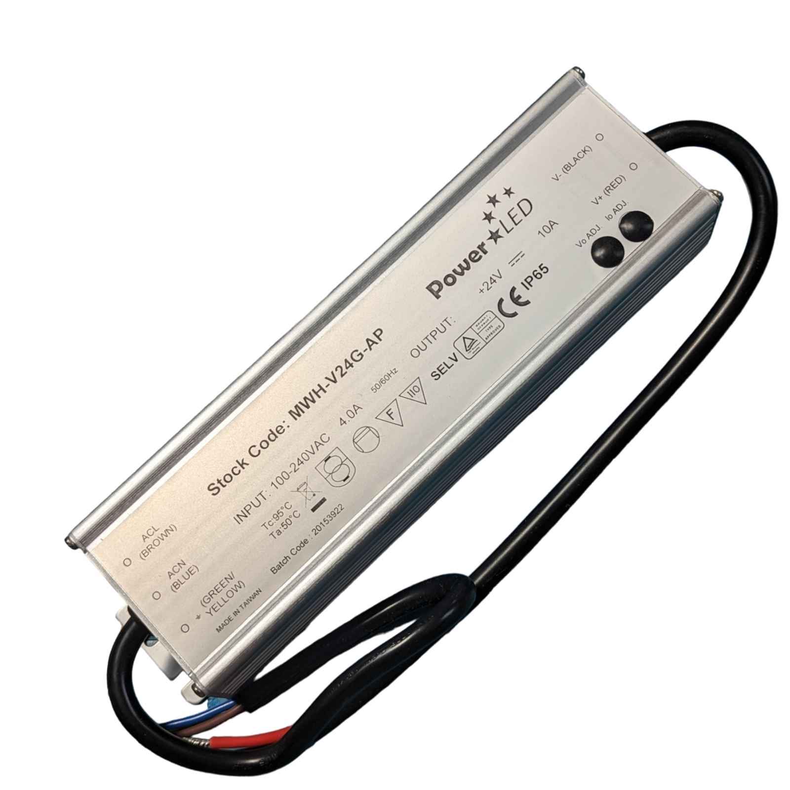 240W 24V 10A constant voltage LED lighting power supply from Powerled. Universal 100-240VAC input with multiple protection features for commercial LED installations.
