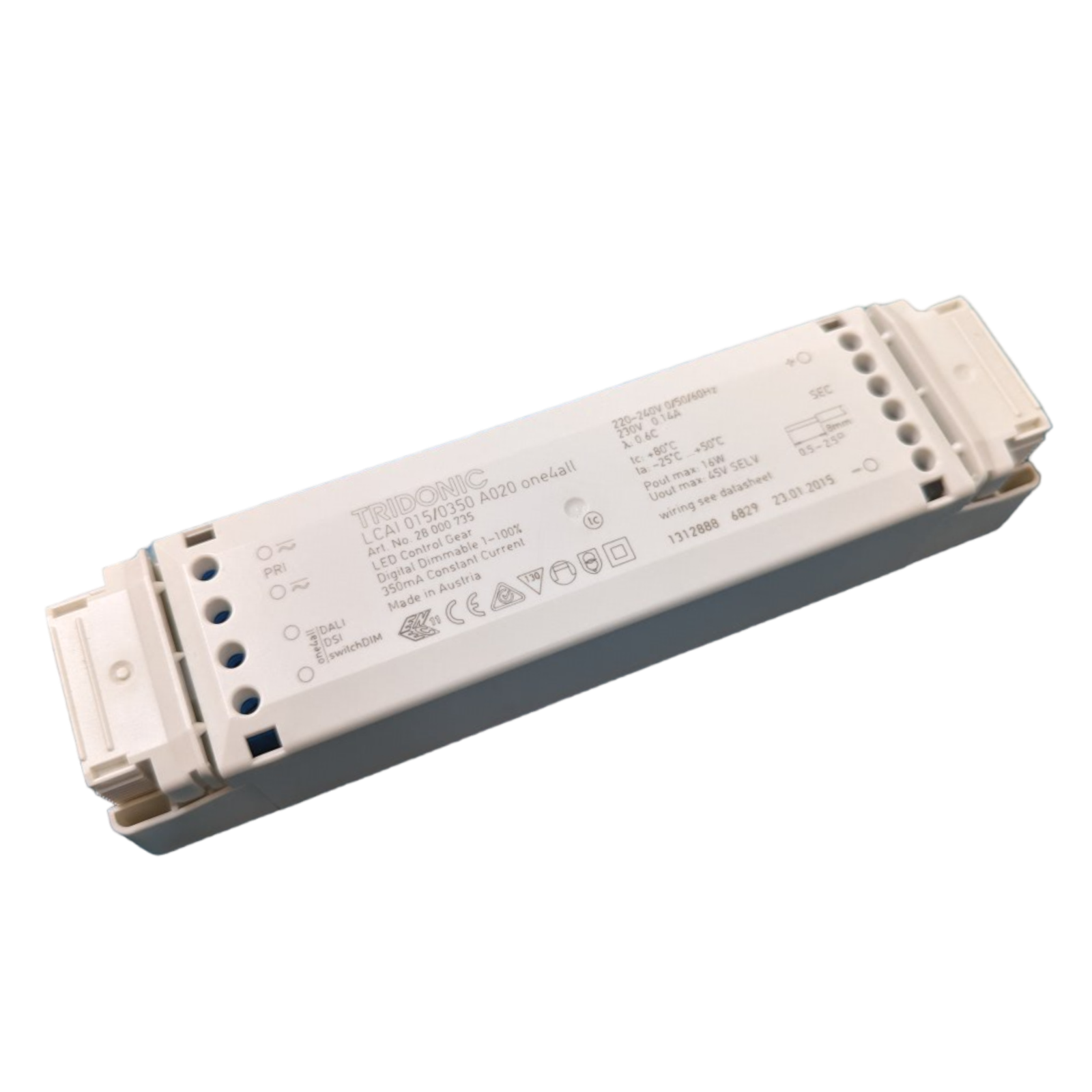 Tridonic LCAI 15W 350mA one4all digital dimmable LED control gear. DALI compatible, dimmable 1–100%, ideal for intelligent LED building control and luminaire applications.
