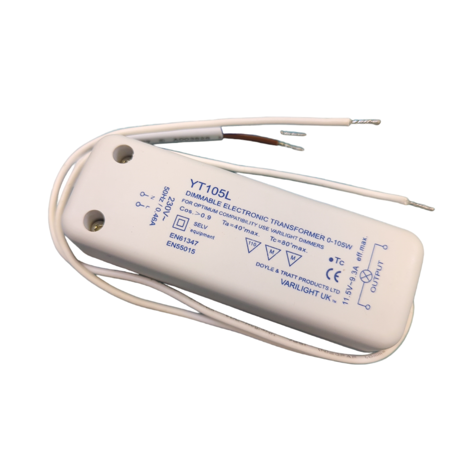 YT105L dimmable electronic transformer for low-voltage lighting. Compatible with Varilight and other phase-cut dimmers, 230V AC input with 0.22A current draw.